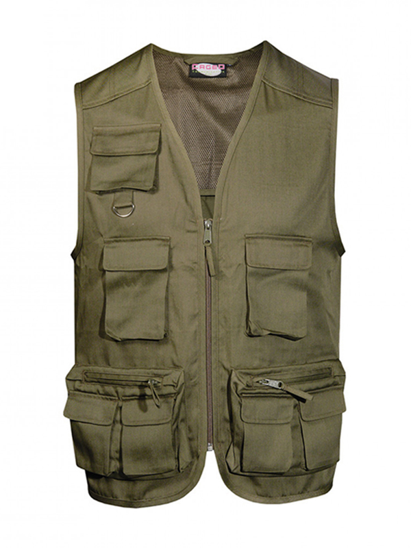 Γιλέκο αδιάβροχο με λάστιχο στους ώμους για στεγανότητα απο τον αέρα και πέντε τσέπες , οι τρείς με καπάκι και οι δύο με φερμουάρ .