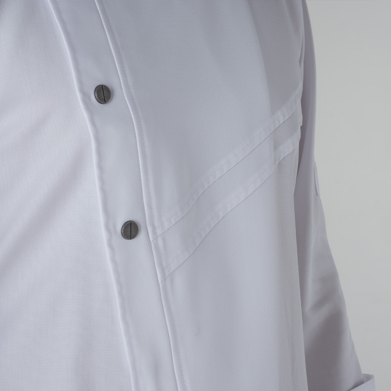 Έχει ένα ασυνήθιστο κούμπωμα, εν μέρει εκτεθειμένο – Ένα παιχνίδι κοψίματος και ραφών κυριαρχεί στο μπροστινό μέρος του σακακιού, το οποίο ολοκληρώνεται από την τσέπη για στυλό με κέντημα με το λογότυπο «G» από νήμα από polineon και τετράγωνες μανσέτες.
